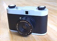 発売年:?レンズ:AURORA LENS 40mm/F8 サイズ:103×64×50mm シャッター速度:B・?(単速) 重量:約125g 電池:なし 当時価格: オールプラスチック製の単焦点ハーフサイズカメラ。(レンズまわりに「AURORA CO.」とメーカーが記載されている。)フィルム装填は脱着式の裏蓋を取り外す、ライカ方式。鏡胴横に付いている小さなスイッチを倒すと、バルブシャッターとなる。プラスチックの鏡胴には、レンズが1枚。原理的にはピンホールカメラに近い。ガラスがない素通し等倍ファインダー。フィルムカウンターは軍艦部にあるが、機能するものなのか、飾りなのかは不明。 このカメラについて、情報をお持ちの方はメールにてご連絡ください。 |