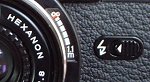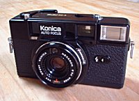 発売年:1980年レンズ:HEXANON 38mm/F2.8 サイズ:128×73×54mm シャッター速度:1/60.1/125.1/250秒 重量:約375g 電池:単3乾電池 2個 当時価格:42800円 オートフォーカス初代ジャスピンコニカの外観デザインを一新した、2代目ジャスピンコニカハンディ。距離測定精度の向上さるとともに、撮影の失敗を防止する工夫として、電池電圧が降下するとシャッターが切れなくなる、レリーズロック機能が搭載されている。レンズ横の指針は距離指標。 |