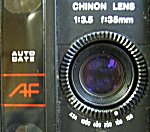 発売年:1983年レンズ:CHINON LENS 35mm/F3.5 サイズ:133×68×51mm シャッター速度:EV8.6〜EV17(ASA100) 重量:約320g 電池:単3乾電池 2個 LR44アルカリ乾電池 2個(オートデート用) 当時価格:44800円 オートフォーカス、プログラムAEカメラ。赤外線アクティブ方式によるオートフォーカス。レンズは3群3枚。露出警告はファインダー横の赤LEDによる。オート巻き上げ、巻き戻し。レリーズしている間、連写することが可能。背面には液晶表示のオートデートユニットがある。 |