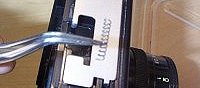 ![]() ![]() | BelOMO「ВИЛИЯ-VILIA」というロシア製のカメラ。(注)カメラ名のロシア文字は機種依存文字のため、コンピュータによっては正しく表示されていない場合もありますご了承ください)ボディー底面には、ちゃんとMADE IN USSRと書いてある。白ロシアのミンスクにあるBelOMOというメーカー製で、発売年は1973年というカメラ。 表面には巻き上げクランクの奥にネジが1つあるだけ、どうやって開けようか?ロシアのカメラの中をどうしても見てみたいのです。カメラ側面にシンクロ接点、逆側側面には小さなカニ目のついているビスが。これが怪しい。案の定これらを外すとL字型の金具が取れ、内部が見えました。その際、裏蓋を止めている小さなスプリングをなくさないように注意です。どこかに飛んでいったら大変です。 |
