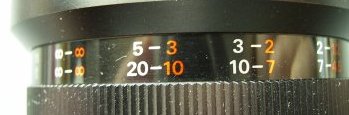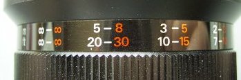 写真上がワイドレンズ、下がテレレンズの距離補正表示です。 白文字が物体までの距離を、オレンジ文字がカメラの距離設定を表しています。距離計の二重像が合致した時の、カメラ本体の距離リング表示が物体までの距離です。例えば、この物体までの距離が5mのとき、ワイドでは8mにテレでは3mに、本体の距離を設定しなおす必要があるということです。 外付けのファインダーは、周囲にWIDEのブライトフレーム、その内側にTELEのブライトフレームがある、テレワイド共用のものです。 |