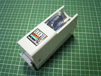 ![]() | 続いて、同じくAGタイプの電球を使用するMINOLTAのデュオフィットSという珍しいものをご紹介します。小型(高さ65mm)でありながら、ノンコード式とコード式いずれにも対応したものです。このままカメラのホットシューに指し込み使用することができます。 |