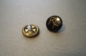 ![]() | ねじの頭に少量の接着剤をつけ、キャップに付けます。キャップ裏面の王冠型三角形の先端を少し切り取り、ねじ側に折り曲げます。この状態が写真左です。 写真右は、黒色塗装されたキャップに、Range Finderの頭文字を刻印したものです。ルーターの先に細いヤスリを付け書いてみました。 |