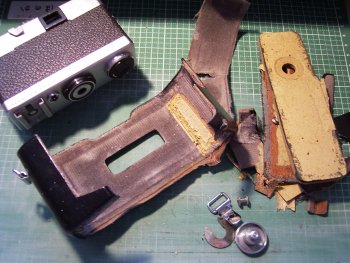 さて、今回は手元にあったKONICA EE-MATIC260のケースを、ローライB35用に作り変えることにしました。ローライ35の両側面にはアイレットがなく、ネックストラップを使ってカメラを水平の状態で首にかける場合は、スナップホルダーが必要になります。 写真は、ケースをペンチなどでばらばらにした状態です。このケースは、糸縫いではなく接着剤で加工されていました。 |