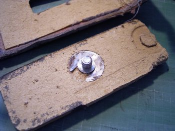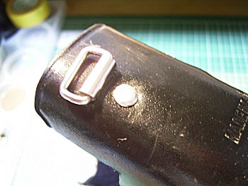 ![]() | カメラに合わせてケースが小さくなった分、側面にある金具の位置がずれてしまいます。写真は、金具を新たな位置に取り付けたもので、リベットで固定しました。 |