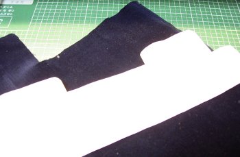 ![]() | カメラに合わせてケース革を巻きつけ、余分な部分をカットしました。写真は、ケース内側に貼る布です。自宅を探すとビロードの端切れがありましたのでこれを利用しました。型紙を当てて裁断します。 |