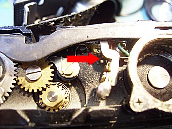 簡単なレストアで直ると思っていたのですが、かなりの重症でした。 まずは、露出計です。電池からコイルまで電流がきていませんので、断線を疑いました。なかなか原因が分からず時間を要しましたが、 巻き上げのカムの陰に小さなスイッチを発見。巻き上げた時のみ、これがONになる仕組みでした。ONにならないのは、赤矢印のカムが固着が 原因でした。 |