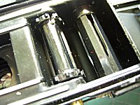 折れているのならすぐに分かるのですが、熱で縦方向に縮小(赤矢印)してしまっていることには気が付きませんでした。よく見ると、爪がねじれています。これも熱によって変形したようです。 これは交換するしかありません。部品取りカメラから探したのですが、スプロケットの形状は機種によって随分違うもので、なかなか合うものが見つかりません。やっと軸径の合うものを探したのですが、今度は背丈が長いのです。上端下端を切り取り、スライド部分に切れ目を入れて、やっと完成しました。(写真右) 以上、簡単に直りそうな予感が、大外れ、大変なレストアになってしまいました。しかし、グリーオマチックの代用方法を見つけて楽しいレストアとなりました。 |