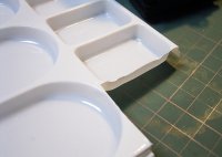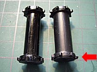 ![]() ![]() | 身の回りにある代用品を探して、絵の具のパレットを利用することにしました。中央を円形に切り抜き、フィルムケースを筒として利用しました。接着剤には、黒色のセメダインsuperXを使用しました。写真右のように、つや消し黒の塗装をして完成です。 |