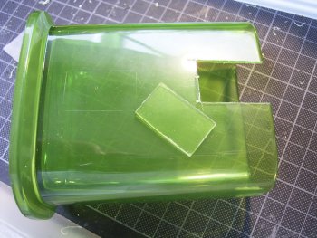 ![]() | 次は、割れた明り取り窓ガラスの復元です。透明ですと、アクリルやプラ板で簡単に復元できる のですが、ご存知のとおりペトリはグリーンのガラスです。代用品を探しに100円ショップに行きました。店内のキョロキョロ見回した結果、写真のペンスタンドを使うことにしました。 |