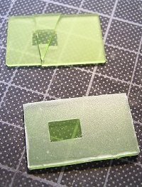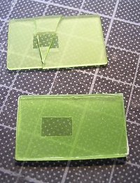 ![]() ![]() | 周囲は半透明なすりガラスです。これは例によってメンディングテープを貼り付け、中心部を切り抜いて代用します。写真左はテープを貼った面、右は反対面です。 |