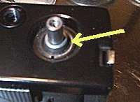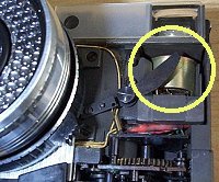 ![]() | 続いて問題の露出計です。写真の部分が露出計本体です。ノコギリのような部品がコイル指針に噛み合い、適正露出を決定する仕組みです。コイル指針部の埃を取り、ベンジンを少々注します。セレンに光を当てても指針が数mmしか動きません。どうやらセレンかセレンからの配線に問題がありそうです。 |