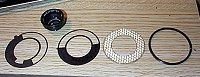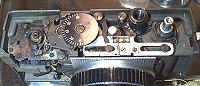 ![]() ![]() | 次に底部を見てみましょう。巻き上げトリガーのカニ目を外し、巻き戻しノブも外します。巻き戻しノブの周りにあるカニ目リングを外すのをお忘れなく。内部のギア群はなかなかしっかりとした動きをしていました。少々注油して完了です。 |