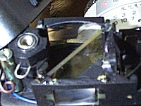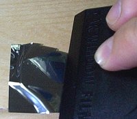 ![]() | ハーフミラーを入手しなくてはなりません。市販されているものもありますが入手しにくいのが最大の欠点です。なんとか、日常品で代用できないかと考えていたところ、小冊子「簡単レストア」をお申し込みになったある方から、アイデアをいただきました。自動車の窓に貼り付ける、ミラーシートです。これはハーフミラーになっていますので使えるはずです。 まず、ハーフミラーを外します。接着剤で頑丈に付いていますので、ドライバの先などでゆっくりと接着部分を剥がしていきます。無理をするとガラスが割れますので注意してください。 |