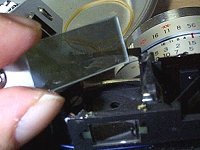 ![]() ![]() | 外したハーフミラーの金属蒸着を、金属磨き剤できれいに拭き取ります。仕上げに中性洗剤で軽く洗っておきます。ミラーシートの接着面をガラスに貼り付けます。空気が入らないようにゴムへらで、強く密着させます。シートのはみ出した部分を切り取り完成です。 ハーフミラー全体にシートを貼るとファインダーが少し暗くなりますので、中央部(二重像が写る)のみにシートを貼るのもいいと思います。最後に、元の場所に戻します。接着剤としては少量のゴム系接着剤を使用しています。決して瞬間接着剤は使用しないでください。後でガラスが曇ってしまいます。 取り付ける際、ファインダーを覗きながら、二重像が上下にずれないようミラーの適正位置を決めます。(分解する前に距離計は、遠くの物を基準として、無限遠にしておくとよいでしょう。ミラーを組み込む際、そこを基準に二重像のずれを補正できます。)大変繊細な部分ですので、要注意です。 以上、ハーフミラー自作で、二重像はクリアになりました。なお、今回は透過率16%のシートを使用しました。蒸着がだめになったハーフミラーに出会っても恐い物なしでしょうか。 |