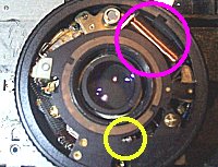 ![]() | これがシャッターです。上部に電磁コイルが見えます。この辺はヤシカエレクトロに似ています。下の黄色丸は、絞り兼用のシャッター羽根を開閉制御しているカムです。これが電磁コイルの作動と連動してシャッター速度を制御しています。どうも電磁コイルが動いていないようです。 |