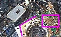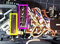 ![]() | やはり内部回路の問題ということになります。鏡胴を外し裏を見ると、案の定、裏面に電極がいっぱいあり、ほこりや皮膜で汚れています。アルコールで洗浄、紙やすりで磨きます。写真のピンク線が、オートのON/OFFを制御しているカムです。 |