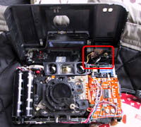 ![]() ![]() ![]() | これで背面が外れました。正面の取り外しにかかります。 先ほどふれた黄緑円のねじを外し、両面テープの残り(白斜線)と2個のつめ(水色 円)に気をつけて外しますが、赤囲みを見ていただけるとわかる通りストロボ部と本体がつながってい ますのでこのような外れ方をします。 赤囲みの部分を外すときはばね等細かい部品がありますのでなくさないようにしてください。ここまで分解できればあとは大丈夫だと思います。 |