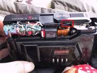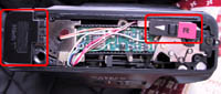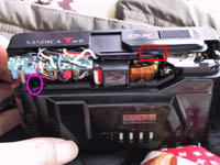 はグリップの下にあります。 ねじが外れたらいよいよ背面の取り外しにかかるのですがここで今回の難関、両面テープが待っています。白斜線部の内側に配線を束ねるのと共にカバー固定の役割なのか両面テープが貼ってあります。 これがわからなくて苦労しました。少し力をいれ、かつボディが割れないように取り外しましょう。 また、この時、頭部のスライドカバーのあたりに(赤囲み)つめがありますので気をつけて下さい。 |