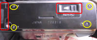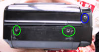 ![]() ![]() ![]() ![]() | 次に側面と背面のねじを外します。(青円〜背面カバー固定ねじ、黄緑円〜正面カバー固定ねじ)青円のねじから外すと作業がはかどると思います。黄緑円が2つ並んでいる所のねじ