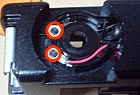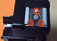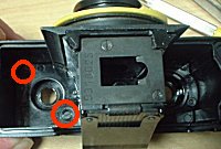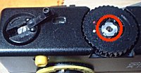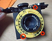 ![]() ![]() ![]() ![]() | AGAT18Kがやってきました。非常に小さなボディー、デザインも斬新です。黄色いリングで絞りを調節できるのですが、どうも正常に動いていないようです。では、分解です。 (1)巻き上げノブ軸の裏面にネジを、外すことで円盤が取れます。写真は円盤を取った状態です。軸を裏面から固定して、写真に見える銀色のリングを回すとノブが外れます。巻き戻しクランクは、中心のネジを外すだけで、取れます。 (2)巻き上げノブの内部に見えるのは、シューに続く電極です。このネジ2本を外します。 (3)シューにはネジが1本、金属プレートを外すと、さらに2本の隠しネジがあります。 (4)フィルム室内にネジが2本あります。これで軍艦部が外れます。 |