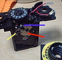 (1)シャッターユニットと鏡胴部分です。3本のネジを外すとシャッターが露出します。 (2)写真下が、シャッター内部です。絞り兼用のシャッター羽根が、赤色のカムが動くことで開閉する仕組みになっています。 (3)黄色線が絞り制御カムです。絞りリングを回転させると、このカムの角度が変化します。 (4)シャッターチャージは、裏面のスプロケット(フィルムを送る小さなギア)を回すことでできます。すると、青色線部分上部の金属が回転し、シャッターを切ると、この金属が青色部分にぶつかり、シャッター羽根を開きます。 (5)その際、先ほどの黄色カムの角度により、そこまでしか赤色カムが回転せず、絞りと開閉速度を制御する仕組みになっています。シンプルですが「なるほど」という構造です。 絞り制御が不安定だったのは、この黄色カムの動きが渋かったためでした。ネジを締め直しベンジンで洗浄して完了です。 |