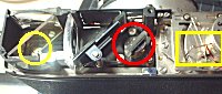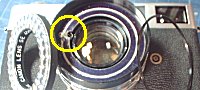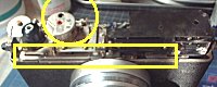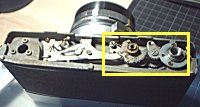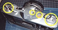 ![]() ![]() | 続いて軍艦部です。底部に比べて簡単に開きます。背面と側面にある小さなネジを3本外すだけです。 写真上で、黄色丸は露出計。黄色長方形はシャッターレリーズボタンと連動して動く金属製カムです。AUTO時とマニュアル時でこのカムの動きが異なりますのでよく観察してください。 写真下は、ファインダー内部です。距離計二重像がずれているときは、水平方向は左黄色丸のネジを、垂直方向は赤丸の反射鏡台座ネジを調整します。右の黄色長方形は露出計指針です。セレンに光を当てた時に、振れるかどうか確認します。 |