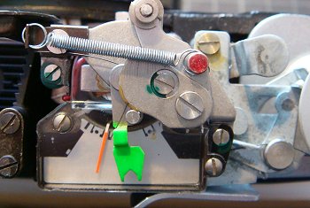 これが軍艦部にある追針式露出計です。赤指針に、緑指針を重ねることにより適正露出が得られます。 この機種のフィルム感度調整は、露出計コイルの角度調整によるもので、光電池の受光面積を制御する 方法ではありませんでしたので、問題なく使えそうです。 |