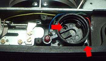 ![]() | 見たところ、断線や腐食はないようです。次のチェックはレンズ上に付いているCdSの受光部です。鏡胴の化粧板を外すと、CdSの裏側のリード線が断線していました。これをはんだ付けして完了!と思ったのですが、これでも、露出計が動きません。 これはおかしい?と再度電池ボックスを見ます。よく見ると、このボックスは二重構造になっています。写真の赤矢印を外すと、底カバーが外れ、電極がいくつか露出します。この金属接点が腐食していました。ヤスリで腐食を削り、電池を入れると、露出計は復活しました。 |