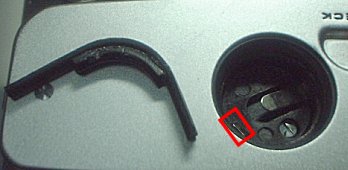 ![]() ![]() | このゴムを電池ボックスにそって入れます。ゴムが二重になっている部分に押され、電池(LR44)は左下に押されます。これにより電池の側面が、電極に接触する訳です。 他にいろいろな方法がありますが、側面に電極があるタイプの、即席アダプタとして紹介させていただきます。 |