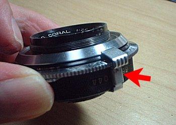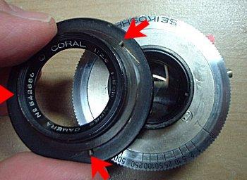 ![]() ![]() | そこで、後ろから攻めることにしました。フィルム室側から後群レンズを外し、続いてその周りにあるカニ目を回すと、シャッターユニットがまるごと外れました。(写真) 矢印が絞りリングを固定(連動)していたノブです。これでやっと外れました。 絞りリングが外れましたので、レンズ名リングを外すことができました。芋ねじが3本ありますので、これを緩めて、やっと前群レンズを外すことができます。前群レンズを外すだけで、随分大変な工程です。無事シャッターの洗浄がすみ動作も正常になりました。 なお、このシャッターユニット元にもどすとき、シャッターチャージカムとレリーズとの連結部分の調整にコツが必要です。何度もやり直しうまくチャージとレリーズができるようになりました。 |