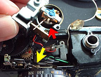 ![]() | そこで、露出計ユニットを外します。露出計はファインダーと一体になっています。露出計横のねじとファインダーの内部に隠れているねじを外してください。そうするとユニットが外れてきます。露出計の底に付いている金属蓋をドライバーで外して、コイルが露出した状態が写真です。ここに小さなねじが入り込んでいました。これではコイル指針が動かないのは当然です。 実は、PENの露出計トラブルはこのことが原因であることが多いのです。内部のねじが外れて、コイル磁石に吸付けられ、露出計内部に入り込みます。カメラ内部にねじが落ちた場合、普通カメラを振るとカタカタと音がするのですが、この場合、ねじは磁石に付いてしまいますので、発見しにくいことになります。 黄色矢印のカムの固着が原因で、赤ベロが出ないなどのトラブルもよくあります。動きが悪ければ、ベンジンで洗浄してください。 |