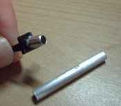 ![]() ![]() | 最後に、この個体、レリーズボタンが折れていました。後期型EE3のボタンはプラスチックなのですね。そこで、例によって自作しようと考えました。どんな材料で作ろうと、部品箱を探すと、ニューム管が目に入りました。そこでレリーズボタンの底の部分を残して、半分折れた上部は切り取り、写真左の黒い部分が残った部分です。その上に、ニューム管を差し込み、接着です。直径を合わせるのに苦労しましたが、なんとかきれいに接着できました。オリジナルに近づけるため黒く塗装して出来上がりです。(ニューム管といえば、子供のころよく作ったゴム動力飛行機を思い出しました。) |