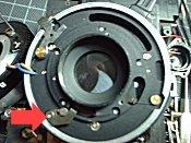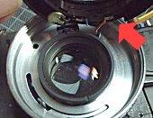 ![]() ![]() | 受光部CdSのチェックです。CdSの抵抗は、光の強さによって変化していますので、正常です。断線もありません。次に、前玉を外すとシャッターに届きます。写真右、赤矢印が絞り羽根を調節するカムです。 |