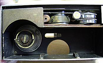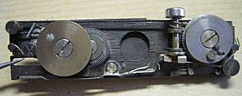 | こちらは、シャッターユニットです。右のノブを回すと、紐とスプリングのテンションが変化し、シャッター速度を変化させています。レリーズボタンがかわいいです。 |