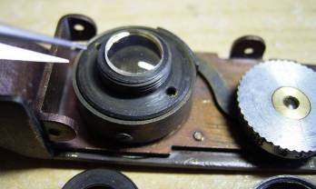 | この小さなレンズが3枚3群のROKKORです。ピンセットの先が大きく見えます。カビはオキシドールで、クリーニングです。右の銀色ノブを回すと、カムが動き、内部の4枚の絞り羽根に連動します。 |