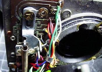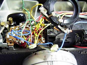 ![]() | となると、つぎは外したくないレンズボードです。シャッターレリーズシャフトに金属接点(スライドスイッチ)があります。写真のように、ここの基板が腐食していました。耐水ペーパーで磨いて、金属光沢が甦りました。なお、軍艦部から追いかけてきたリード線が1本外れていました。はんだ付けです。これで少し不安定さもあるのですが、露出警告ランプも復活、シャッター速度も変化しています。 |