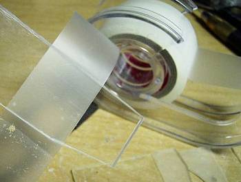 ![]() | 周囲をやすりで整えて、出来上がりです。テープもきれいに貼ると、曇りガラスと見違えるほどになります。なお、プラ板のカットは、プラスチックカット用のカッターで切るときれいに切れます。 |