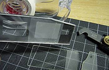 ![]() | 続いて、割れたファインダーガラスのレストアです。ガラスが3つに割れて、その一つが欠損しています。そこで、手元にあった透明プラスチック板で自作です。(アクリル板の方が透明感があっていいのでしょうが)ガラスにあわせてプラ板をカットします。曇りガラスの部分は、たかさきさんのアイディアを借用して、メンディングテープを貼るだけです。 |