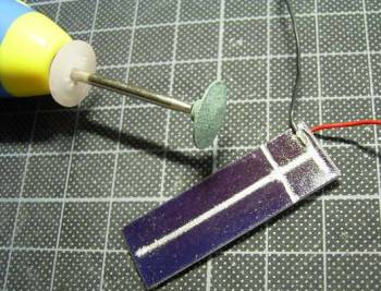 ![]() | セレン光電池です、テスターで測定してもまったく機能していませんでした。このセレン、両側からリード線が出ています。普通は片方からですので、不思議に思いよく見ると、セレン表面に垂直に傷が入っています。セレンを蒸着した部分を削り取っているのです。なるほど、これは1つのセレンを2つに分断させているようです。 |