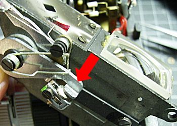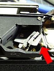 ![]() | 距離計二重像が動かない原因の多くは、このカムの固着です。埃があるまま注油などしないように気をつけてください。ベンジンで洗浄するだけで改善されることが多いものです。カム周辺の部品の動きをよく観察することが重要です。