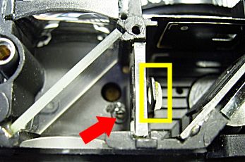 ![]() | 写真左はFUJICA GERのファインダーです。上記と同様に偏角レンズ(黄色)があるのですが、これが固定されていますので、縦調整ができない機種と言われていました。しかし、よく観察すると、この固定金具が赤矢印ねじとつながっているようです。案の定このねじで縦調整が可能でした。 |