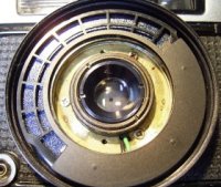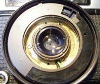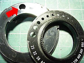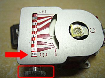 ![]() ![]() | [フィルム感度調整4] 円形セレン光電池を使ったサークルアイ方式でよく使われている調整方法です。フィルム感度ダイヤルと連動した金属板が、セレン電池の上をスライドしていく方式です。写真左はフィルム感度ASA400、写真右はASA25の状態です。金属板で、セレンの受光面積を変化させるシンプルな方法です。 フィルム感度を変更しても絞りの変化がないなどの不具合の場合、この金属板がリングの動きをみてください。金属板がリングから外れているなどの原因が考えられます。 |