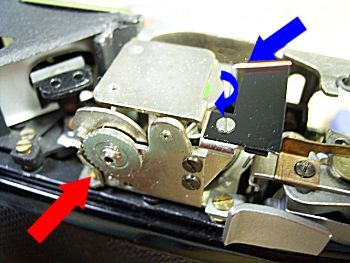 ![]() | [フィルム感度調整3] 調整1のように電気的に指針を変化させるのではなく、露出計本体を少し回転させる方法です。赤矢印がフィルム感度ダイヤルです。これを回転させると、露出計そのものが少し回転し、指針の原点が少しずれる仕組みです。 |