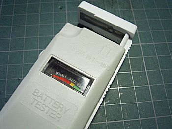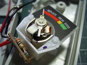 ![]() ![]() | 露出計に電流を流しても指針が動かない原因としては、断線が考えられます。コイルに巻いてある細いエナメル線と、金属端子の間が断線している場合は、はんだ付けすることで改善されます。しかし、コイル内部の断線の場合は、露出計を移植することになります。 同じ機種から露出計を移植するのが最適ですが、そう簡単にジャンク品が見つかることはありません。そこで、写真のバッテリーテスターという乾電池の消耗度をチェックする機械の部品を流用します。レストア仲間の間では有名な手段となっています。 写真下のように、指針まで付いていますので、このまま露出計として使えます。感度は抵抗で調整することができます。なお、このテスターは100円ショップで購入したものです。 |