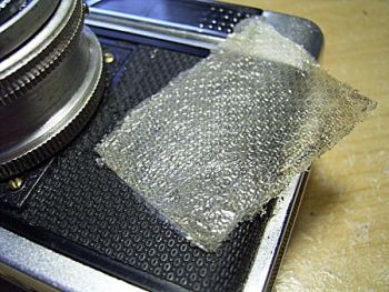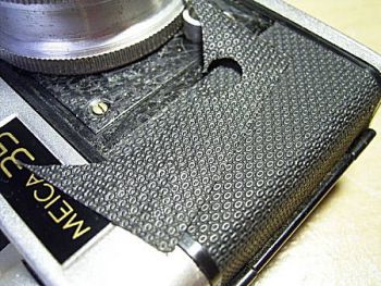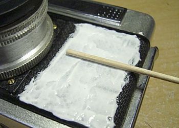 ![]() | 非常に薄く、剥がすとパリパリと割れていくタイプの皮が貼ってあるカメラをよく見かけます。その場合、皮が割れても完全に剥がしてしまって、別の皮を貼るのが一般的です。しかし、今回は、表面に独特の模様があるタイプですので、皮を復元してみようと考えてみました。 いつものように、身近にある素材でチャレンジです。まず、木工用ボンドを通常の貼り皮の上に塗ります。 |
