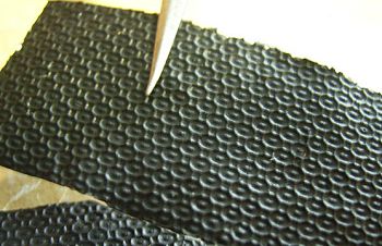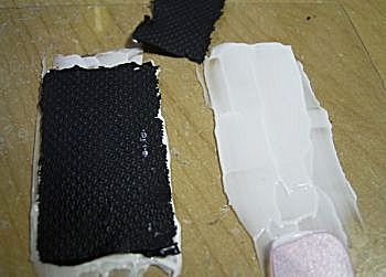 ![]() | この半透明膜に、黒色のスプレー塗料を軽く吹き付けて着色します。ご覧のとおり、貼り皮が復元されました。 課題としては、厚さを均一にする工夫が必要であることと、木工用ボンドは、乾燥後でも少し柔らかい点です。 |