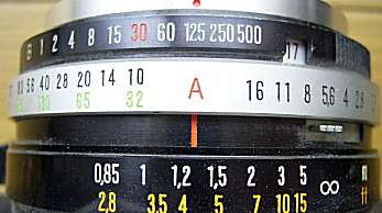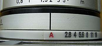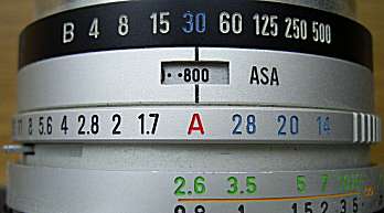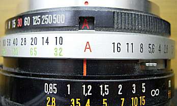 [シャッター速度優先EE・プログラムEE切り替え] 上記の方式を両方兼ね備えた機種もあります。写真はOLYMPUS35SPのものですが、写真上は、絞りリングがAになっていますので、シャッター速度優先EEの状態です。シャッター速度を決めると、適正な絞り値をカメラが決めてくれます。 写真下は、絞りも、速度もAになっていますので、プログラムEE(オート)の状態です。シャッター速度と絞りの両方をカメラが決めてくれます。