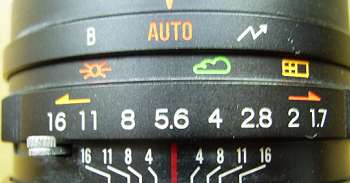 同じように「メーター押さえ込み式」露出計が内蔵されています。リングが「A(オート)」になっています。これは、シャッター速度も絞り値も両方同時にカメラが決定してくれる方式です。これをプログラムEEと言います。シャッター速度や絞りを任意に決めることができません。カメラ任せです。ファインダーにその時の速度や絞りが表示されるものもあります。 このようなプログラムEEの場合、リングを「A(オート)」以外にしてしまうと、ストロボ使用モードになり、絞りを決めることができても、シャッター速度が固定(1/30秒など)になってしまいます。通常撮影は、A位置のみで行います。 |