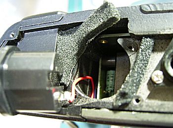 ボックスを留めている2本のねじを外すと、電池ボックスが取り出せます。その奥にリード線がはんだ付けされていますので、切らないように注意してください。